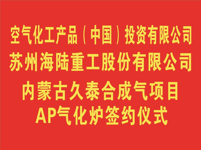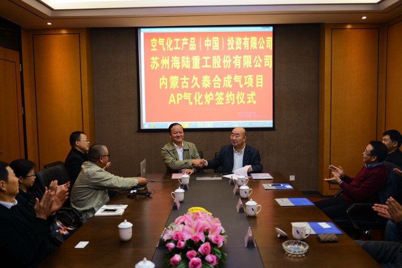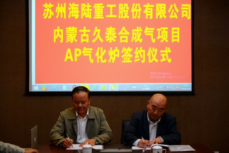2018年12月6日下午,在海陸重工會(huì)議室,空氣化工產(chǎn)品(中國)投資有限公司與蘇州海陸重工股份有限公司,舉行久泰合成氣項(xiàng)目AP氣化爐簽約儀式,AP公司采購總監(jiān)戴曉輝與海陸重工鍋爐事業(yè)部總經(jīng)理陳吉強(qiáng)分別在簽約書上簽字