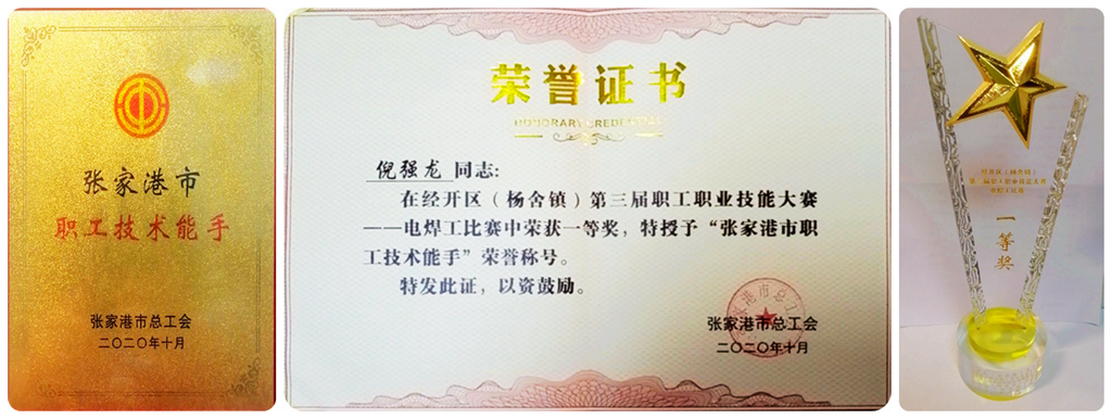 祝賀我公司倪強(qiáng)龍?jiān)诮?jīng)開區(qū)(楊舍鎮(zhèn))第三屆職工技能大賽 電焊工比賽中榮獲一等獎(jiǎng),并被 授予“經(jīng)開區(qū)(楊舍鎮(zhèn))技能 明星”榮譽(yù)稱號(hào)!
